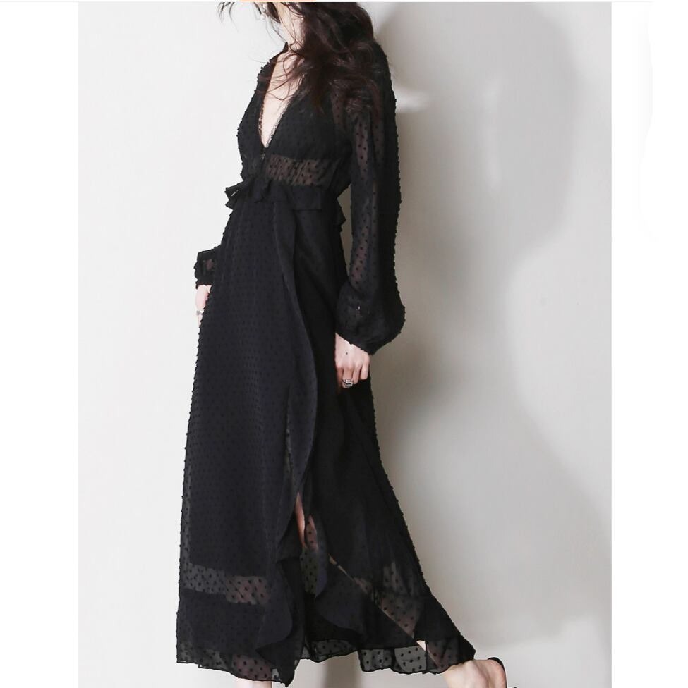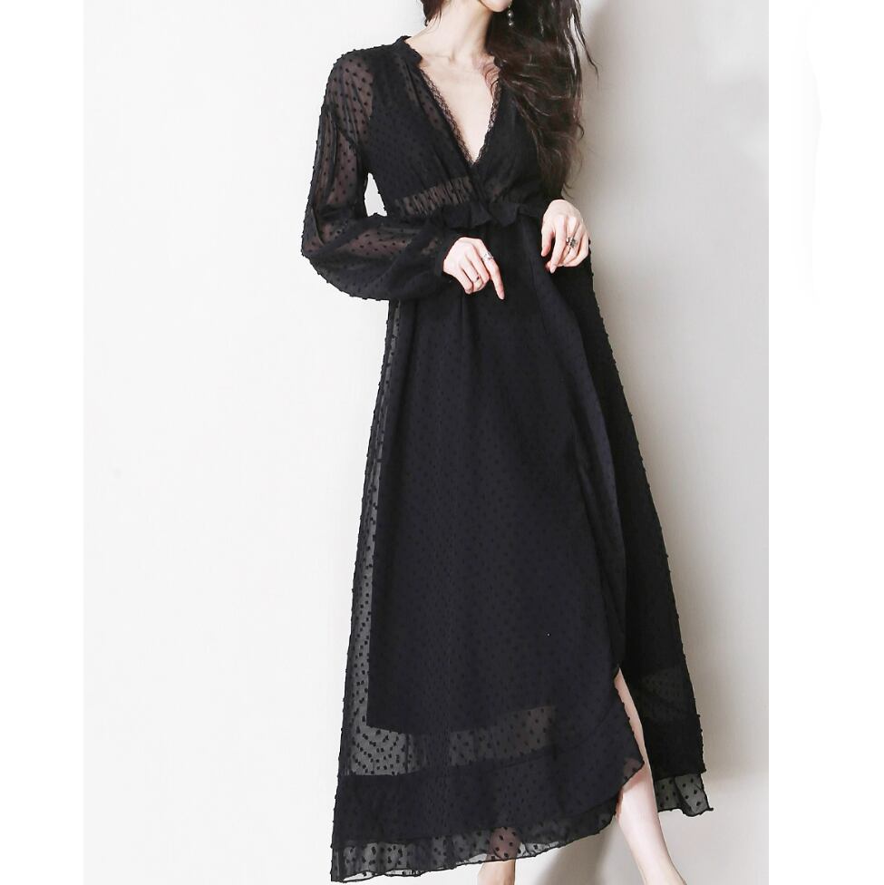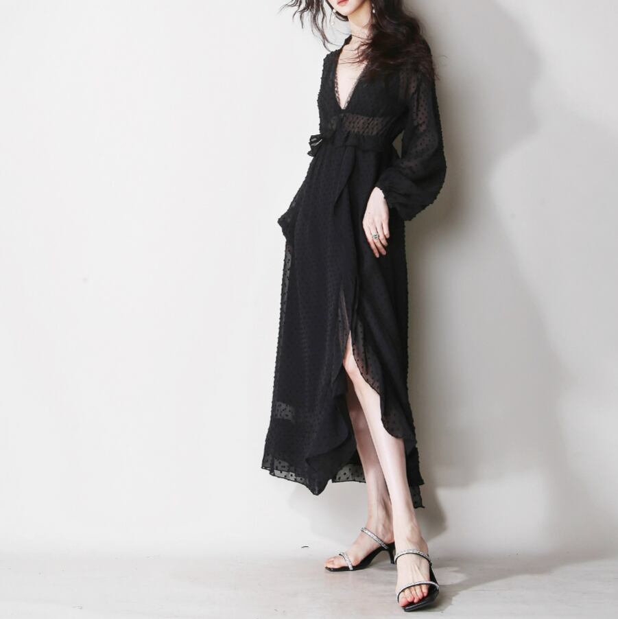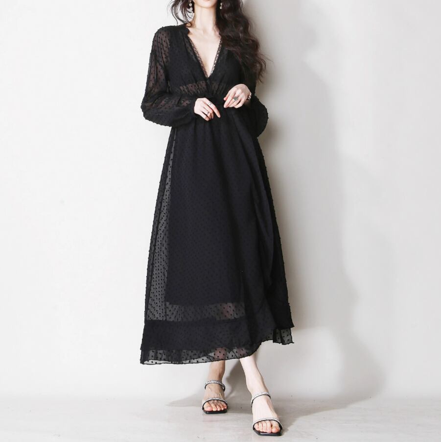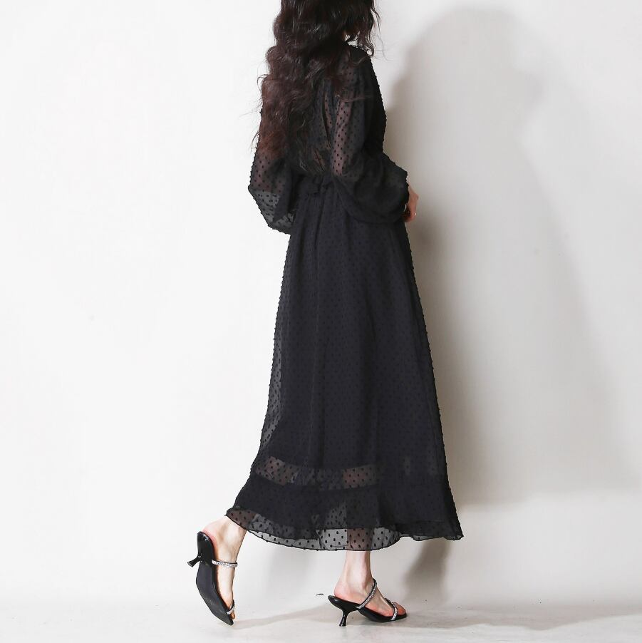 上品なドット柄のシアー素材が大人の色気を引き立てる一着。 深Vネックとスリットで女性らしい抜け感を演出します。 【商品詳細】 カラー:ブラック 【商品サイズ】 S:肩幅 52m/胸囲 96cm/着丈 127cm/袖丈 53cm/ウエスト 71-90cm M:肩幅 53m/胸囲 100cm/着丈 128cm/袖丈 54cm/ウエスト 74-94cm L:肩幅 54m/胸囲 104cm/着丈 129cm/袖丈 55cm/ウエスト 77-98cm ※海外製品につき1cm~3cmの誤差がある場合が ございます。予めご了承くださいませ。 表記は目安として参考にしてください。 【お届けについて】 こちらの商品は海外店舗より直接発送となる為、 ご入金から1~3週間前後で発送致します。 (商品の状況によっては3週間以上かかる場合も あります。その際はご連絡させていただきます) ※沖縄・離島は、別途送料を頂戴しております。 ◼️注意事項 ・タイミングによっては 商品在庫切れにより 注文キャンセルとさせていただく場合も ございますので、予めご了承くださいませ。 ・こちらは海外インポート商品となります。 日本製とは検品基準とは異なり、作りが あまい場合がございます。 ・お手持ちのPCやスマートフォンの画面により 商品の色に若干異なる場合がございます。 ・イメージ違いやサイズ等、お客様都合による交換、 返品、キャンセルは対応出来かねます。 ———————————————— ご購入前に必ずお読みくださいませ ↓ ↓ ↓ https://shop.gramu-official.jp/about —————————————————