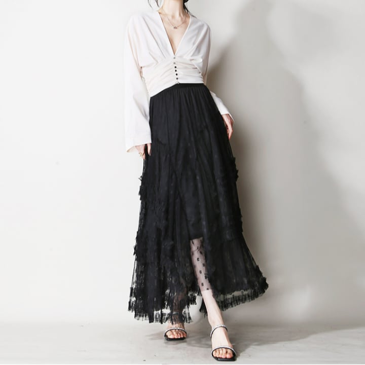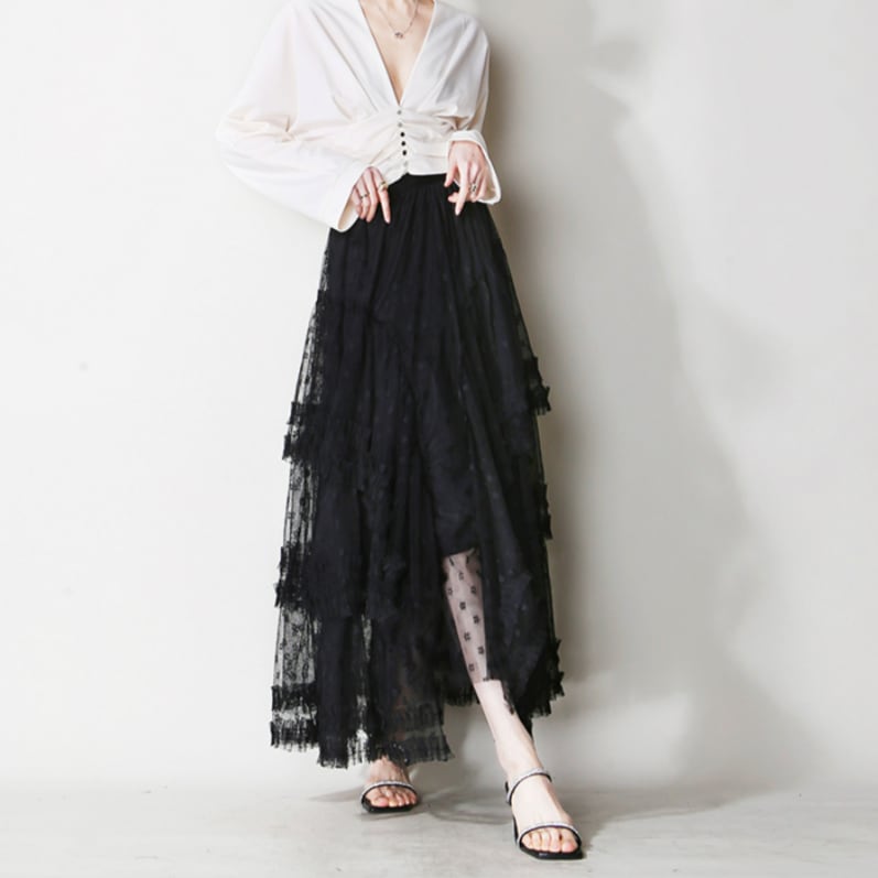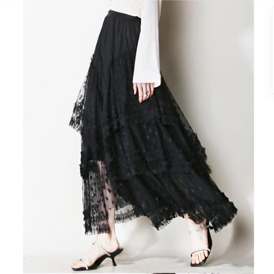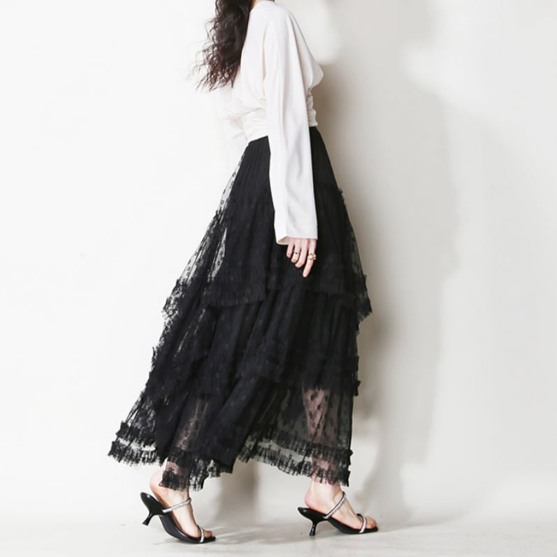 揺れる繊細レースが魅了する、ブラックチュールスカート G1075