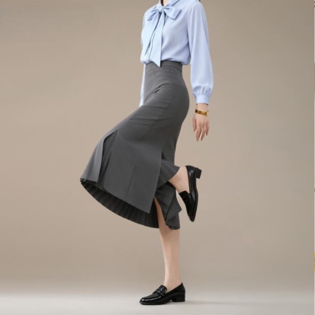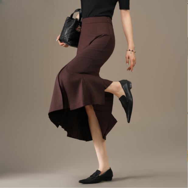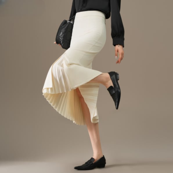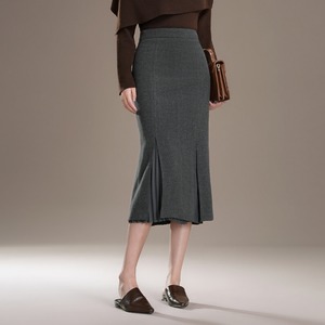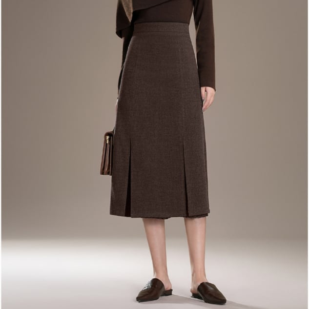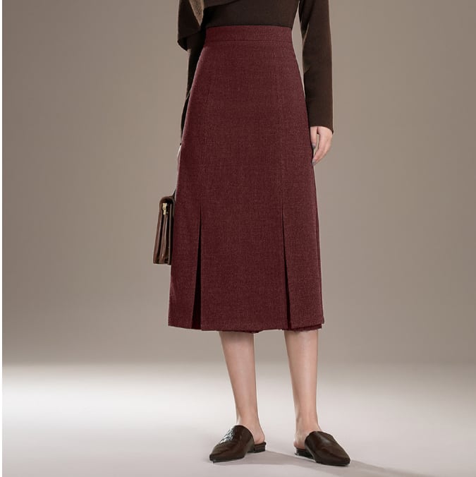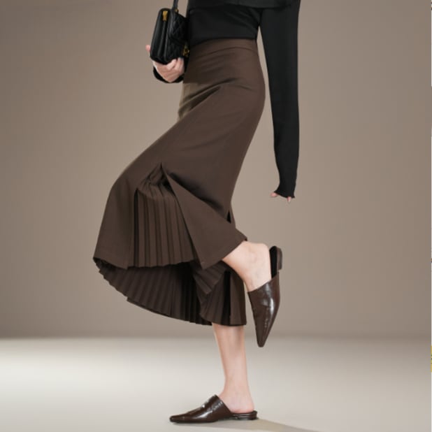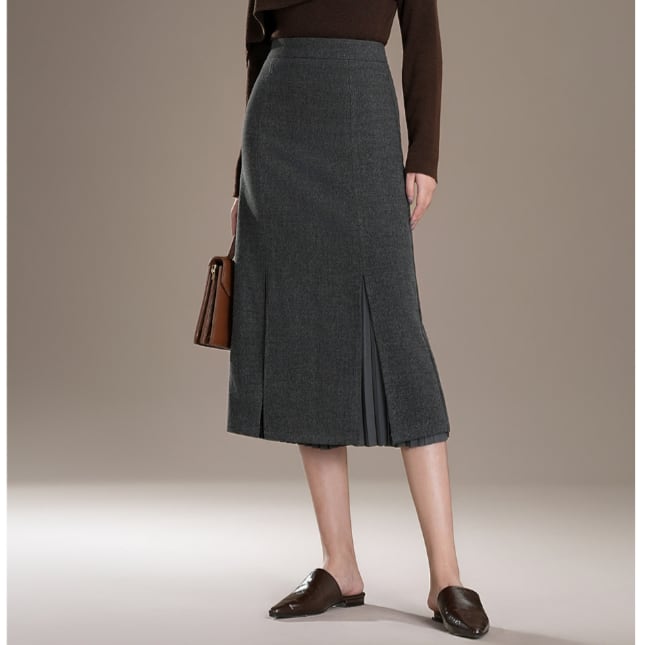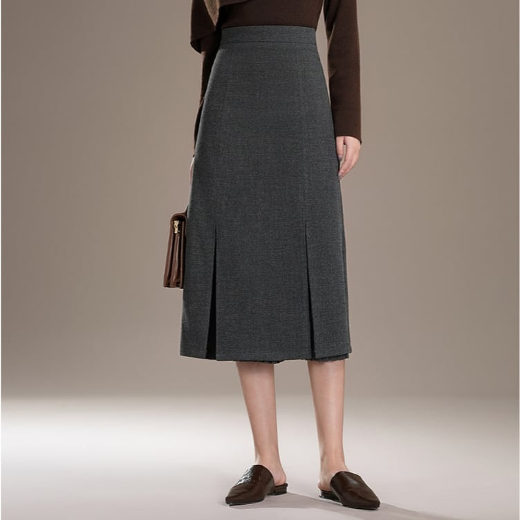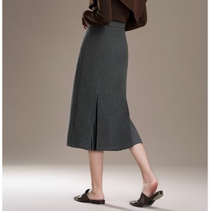 上品なカラーにサイドプリーツ切替を施したミディ丈スカート。