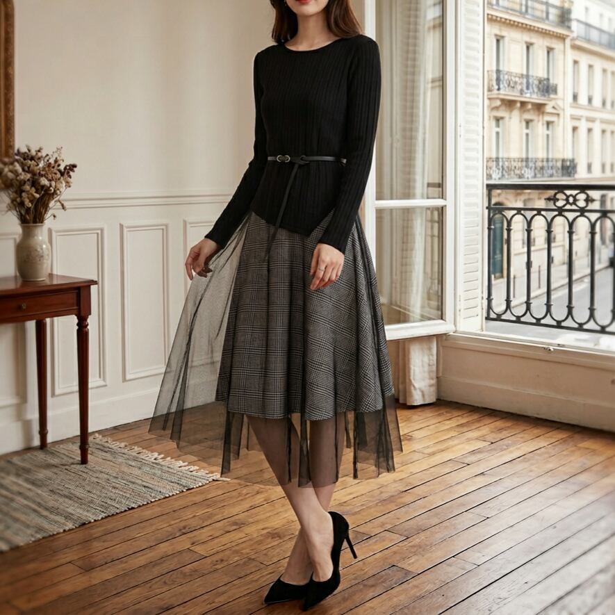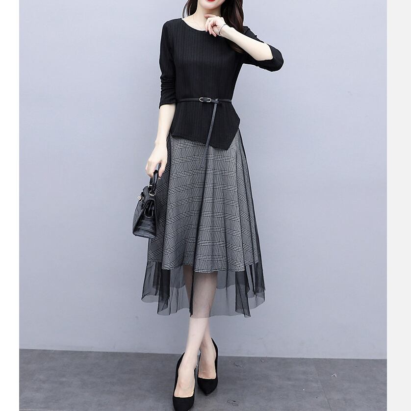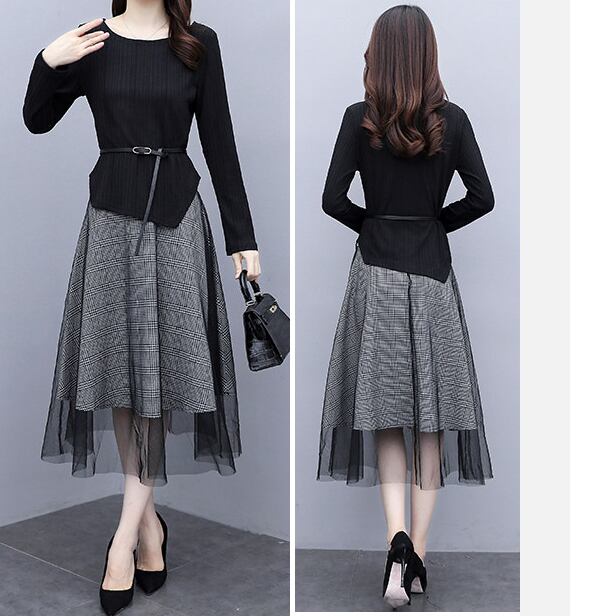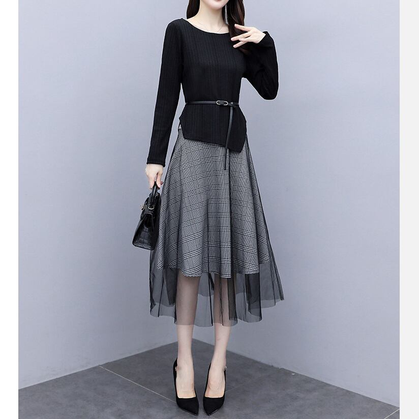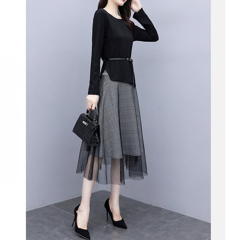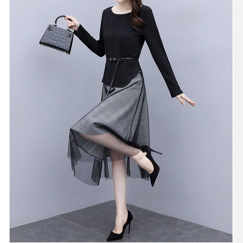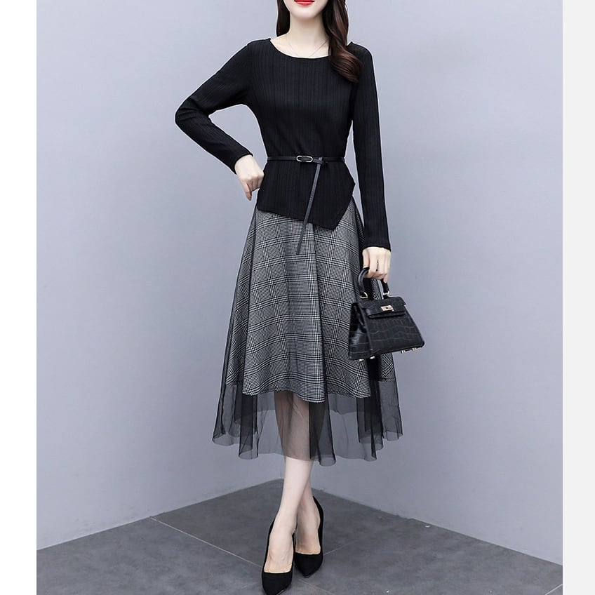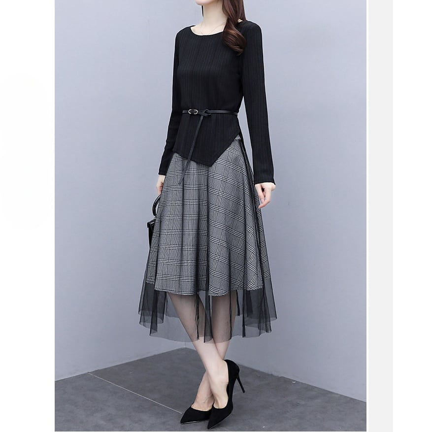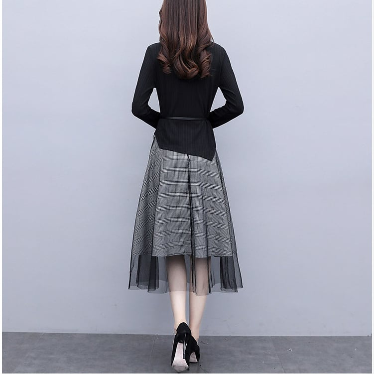 パッチワークメッシュ チェックスカート ツーピース G1229