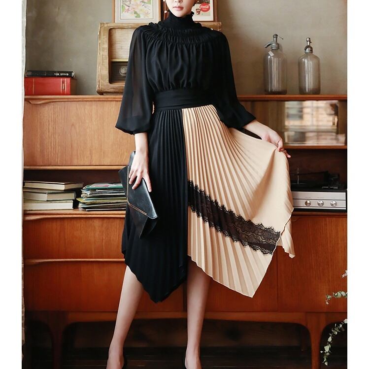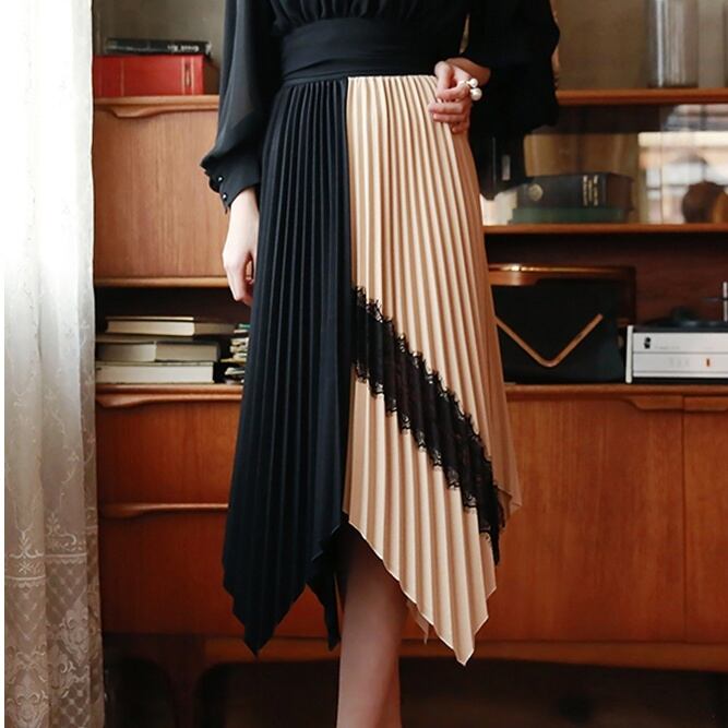 カラーブロックイレヘムプリーツスカート ツートンカラーリボン G0005