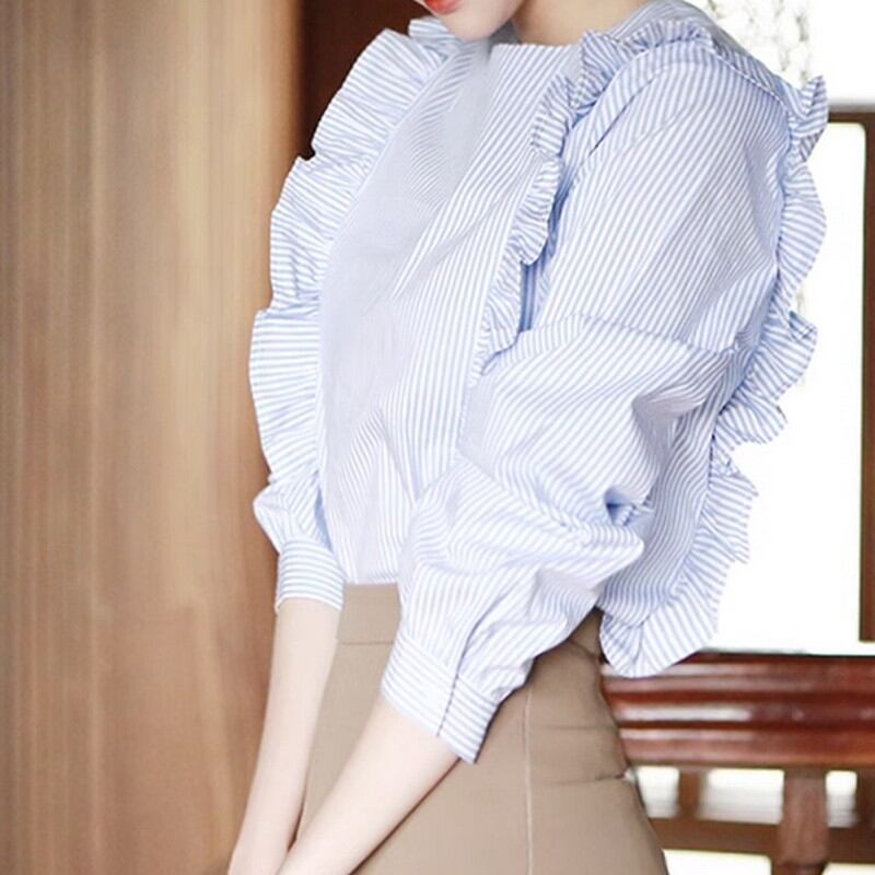 青空を連想させるような爽やかなストライプシャツ。 デニムやスカートと合わせたコーデはとってもキュートでお出かけにぴったり。 肩から続くフリルがアクセントの大人可愛いトップスです♪ 【商品詳細】 カラー:ホワイト+ブルー 素材:コットン65%、ナイロン35% 【商品サイズ】 S:肩幅 38.5cm/胸囲 94cm/着丈 63cm/袖丈 60cm M:肩幅 39.5cm/胸囲 98cm/着丈 63cm/袖丈 62cm L:肩幅 40.5cm/胸囲 102cm/着丈 64cm/袖丈 62cm XL:肩幅 41.5cm/胸囲 106cm/着丈 64cm/袖丈 63cm ※海外製品につき1cm~3cmの誤差がある場合が ございます。予めご了承くださいませ。 表記は目安として参考にしてください。 【お届けについて】 こちらの商品は海外店舗より直接発送となる為、 ご入金から1~3週間前後で発送致します。 (商品の状況によっては3週間以上かかる場合も あります。その際はご連絡させていただきます) ※沖縄・離島は、別途送料を頂戴しております。 ◼️注意事項 ・タイミングによっては 商品在庫切れにより 注文キャンセルとさせていただく場合も ございますので、予めご了承くださいませ。 ・こちらは海外インポート商品となります。 日本製とは検品基準とは異なり、作りが あまい場合がございます。 ・お手持ちのPCやスマートフォンの画面により 商品の色に若干異なる場合がございます。 ・イメージ違いやサイズ等、お客様都合による交換、 返品、キャンセルは対応出来かねます。 ———————————————— ご購入前に必ずお読みくださいませ ↓ ↓ ↓ https://shop.gramu-official.jp/about —————————————————