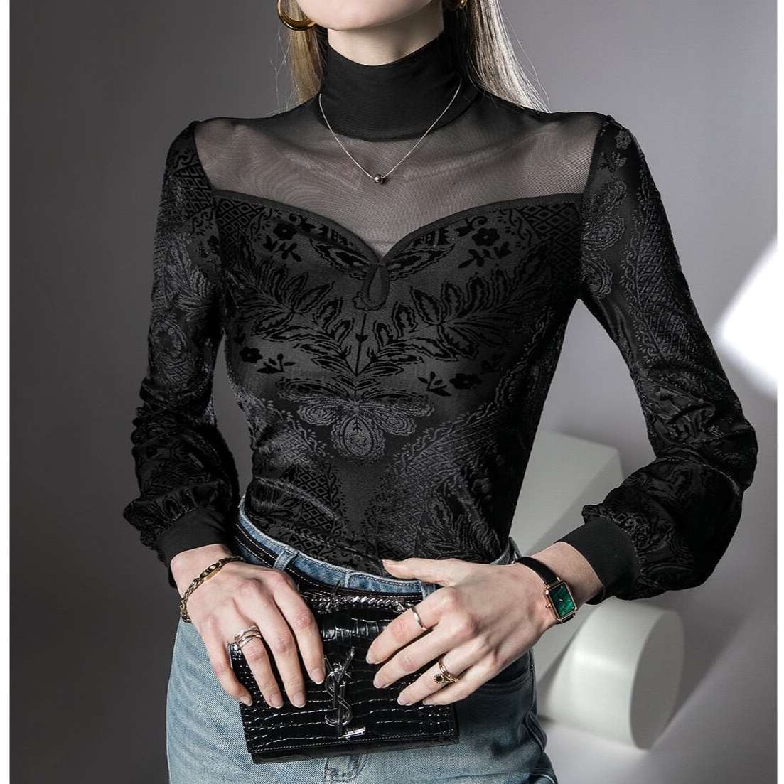 デコルテラインのシアー素材とジャガードの組み合わせが新鮮な長袖トップス。 タイトめのフォルムにボリューム感のある袖でメリハリを感じさせるデザイン。 高級感があり一枚でも映える主役級のトップスです。 【商品詳細】 カラー:ブラック 素材:ナイロン47.3%、ポリエステル39.2%、スパンデックス13.5% 【商品サイズ】 S:肩幅 35cm/胸囲 78-88cm/着丈 62cm/袖丈 62cm/袖口 16cm/裾まわり 80-90cm M:肩幅 36cm/胸囲 82-92cm/着丈 63cm/袖丈 63cm/袖口 17cm/裾まわり 84-94cm L:肩幅 37cm/胸囲 86-96cm/着丈 64cm/袖丈 64cm/袖口 18cm/裾まわり 88-98cm XL:肩幅 38cm/胸囲 91-101cm/着丈 65cm/袖丈 64cm/袖口 19cm/裾まわり 93-103cm 2XL:肩幅 39cm/胸囲 96-106cm/着丈 66cm/袖丈 65cm/袖口 20cm/裾まわり 98-108cm ※海外製品につき1cm~3cmの誤差がある場合が ございます。予めご了承くださいませ。 表記は目安として参考にしてください。 【お届けについて】 こちらの商品は海外店舗より直接発送となる為、 ご入金から1~3週間前後で発送致します。 (商品の状況によっては3週間以上かかる場合も あります。その際はご連絡させていただきます) ※沖縄・離島は、別途送料を頂戴しております。 ◼️注意事項 ・タイミングによっては 商品在庫切れにより 注文キャンセルとさせていただく場合も ございますので、予めご了承くださいませ。 ・こちらは海外インポート商品となります。 日本製とは検品基準とは異なり、作りが あまい場合がございます。 ・お手持ちのPCやスマートフォンの画面により 商品の色に若干異なる場合がございます。 ・イメージ違いやサイズ等、お客様都合による交換、 返品、キャンセルは対応出来かねます。 ———————————————— ご購入前に必ずお読みくださいませ ↓ ↓ ↓ https://shop.gramu-official.jp/about —————————————————