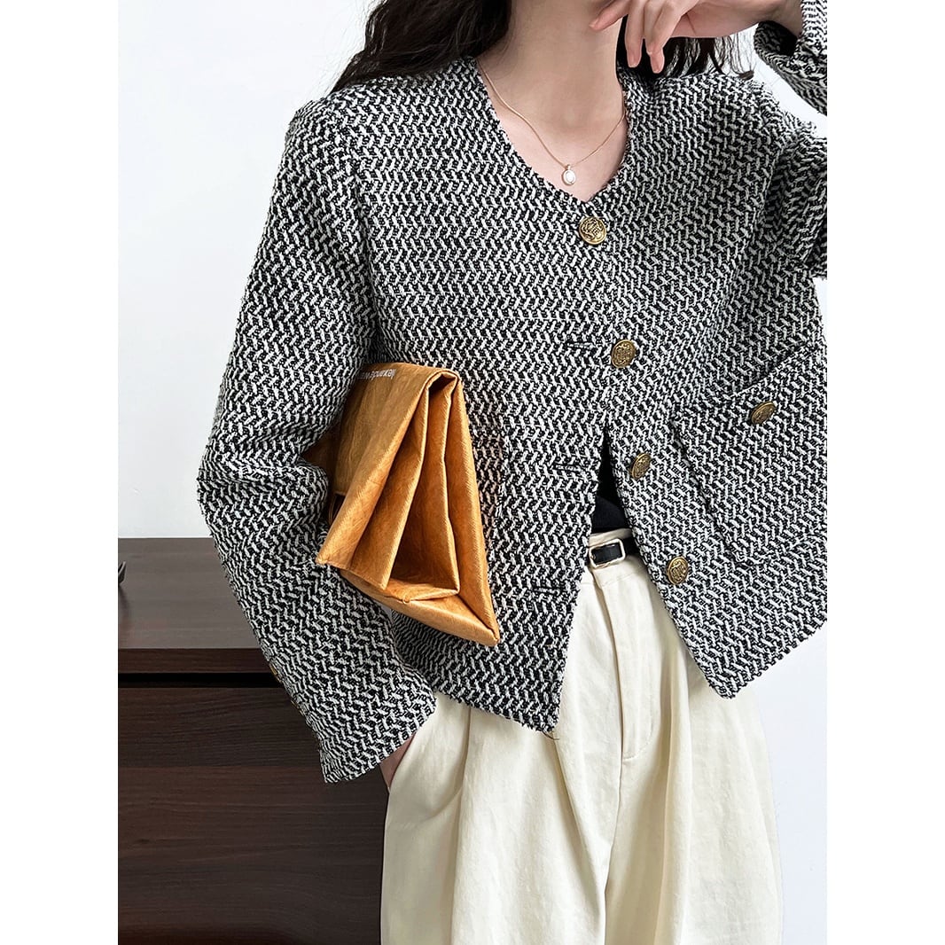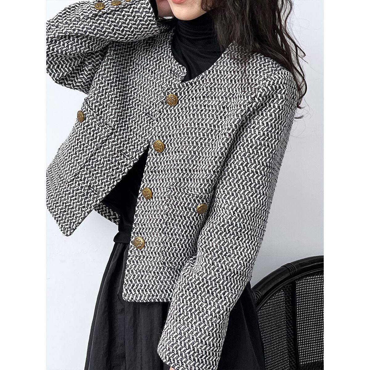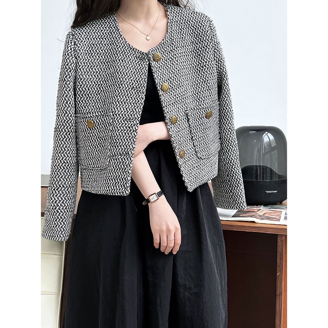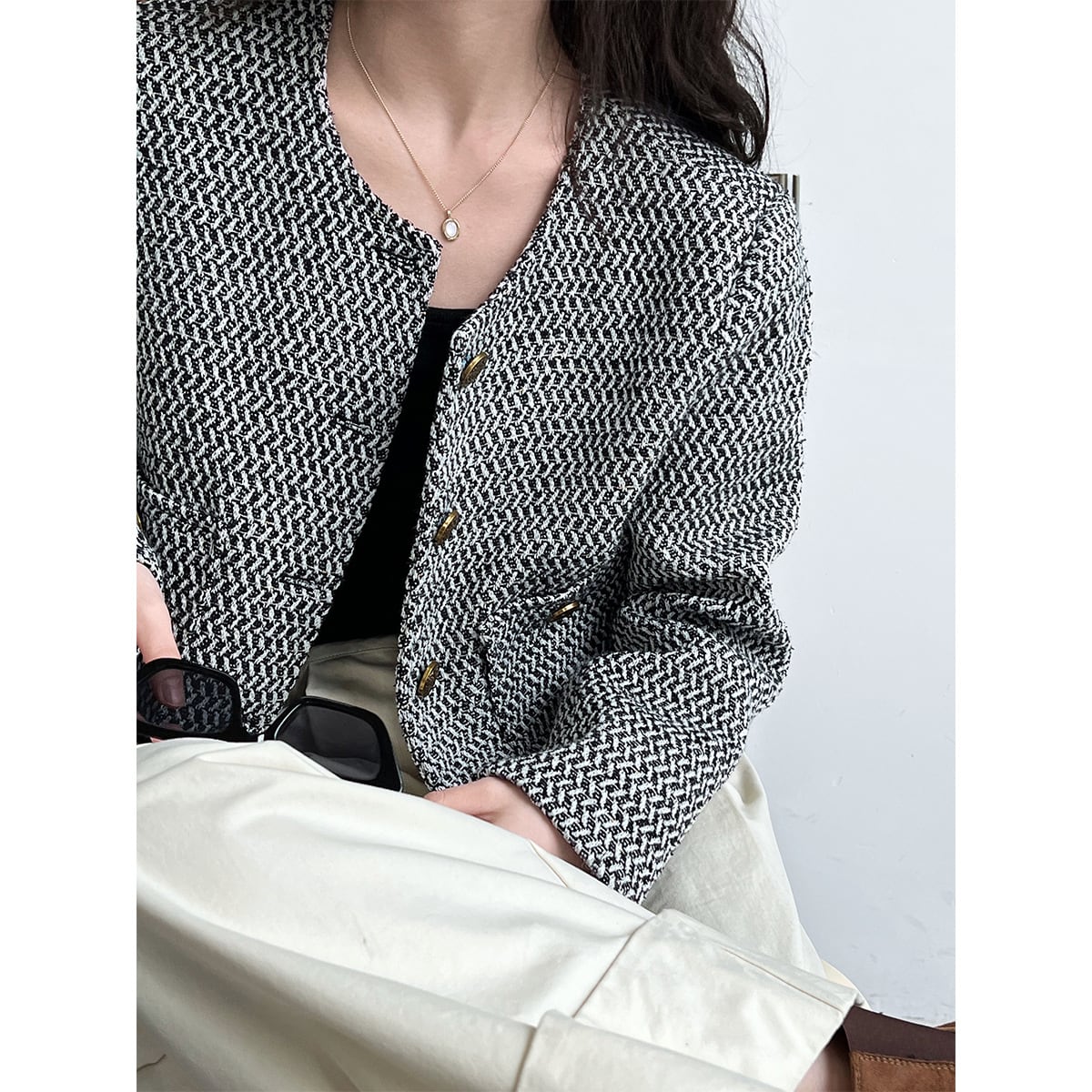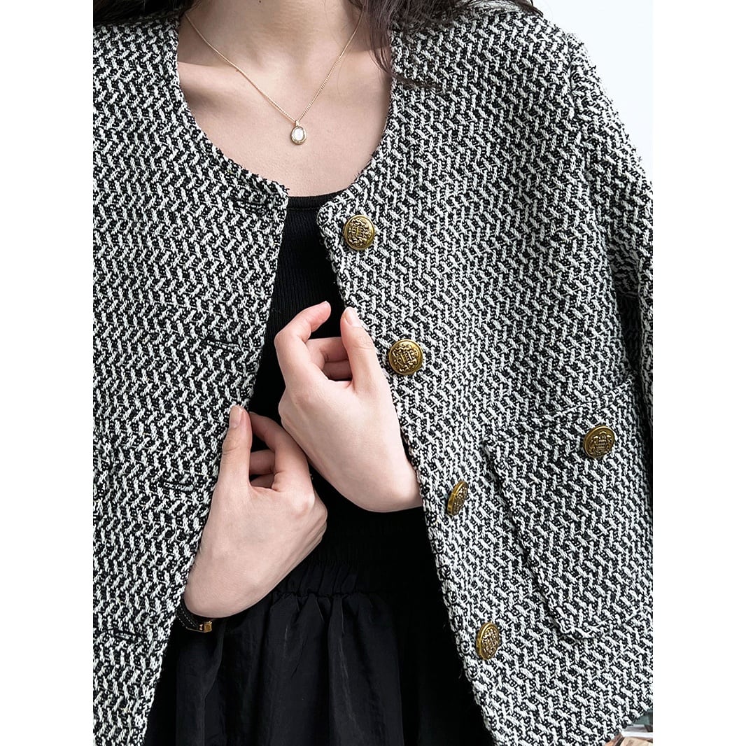 ヘリンボーン柄のツイードジャケットは大人女性にぴったり。