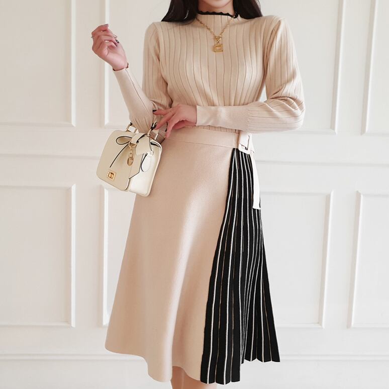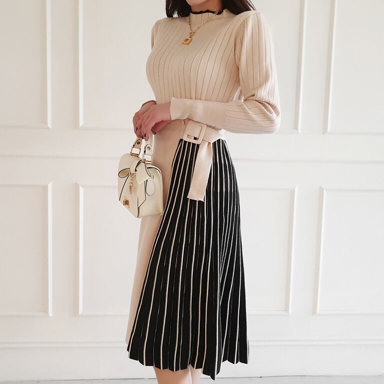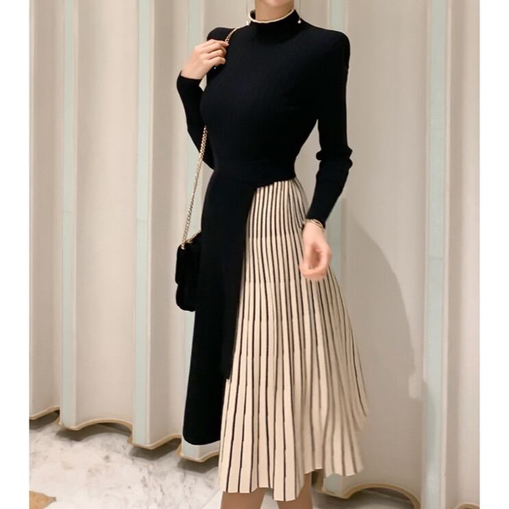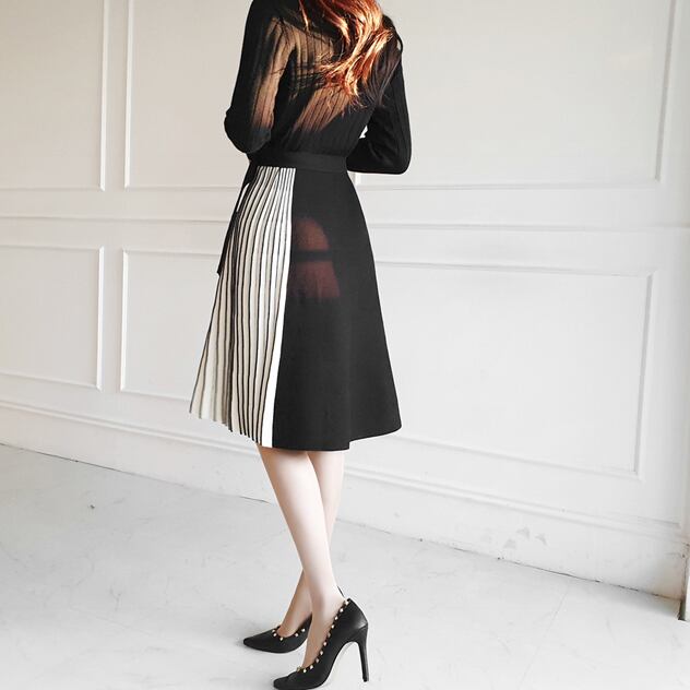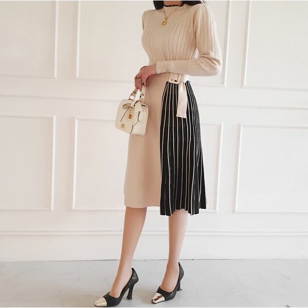 ミドル丈ツートンカラーワンピース プリーツ G0447
