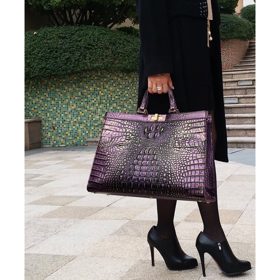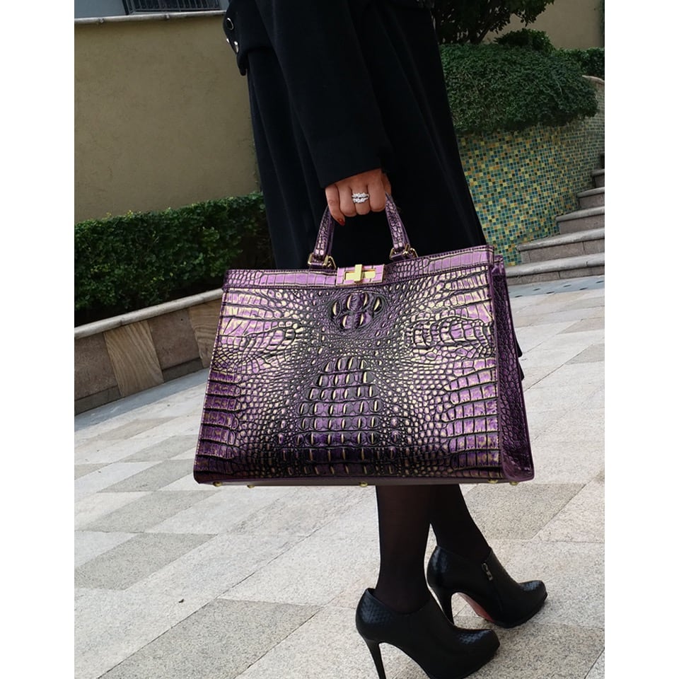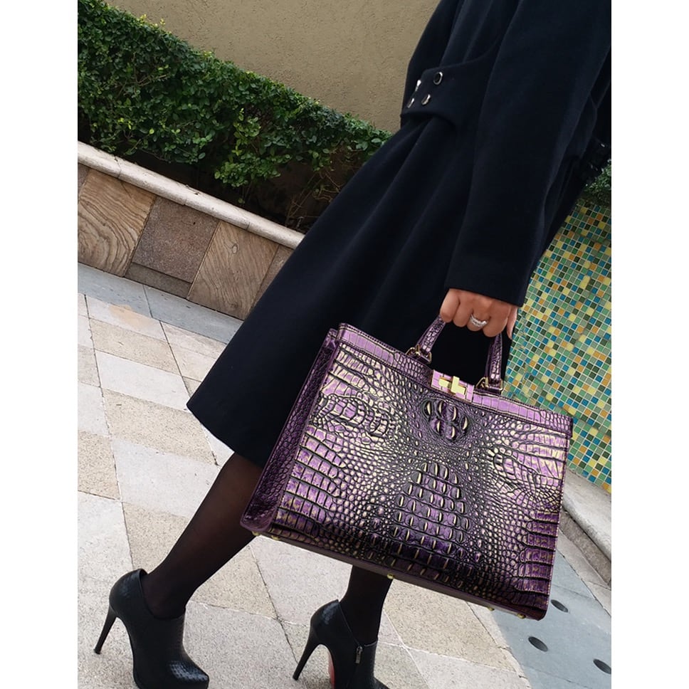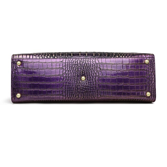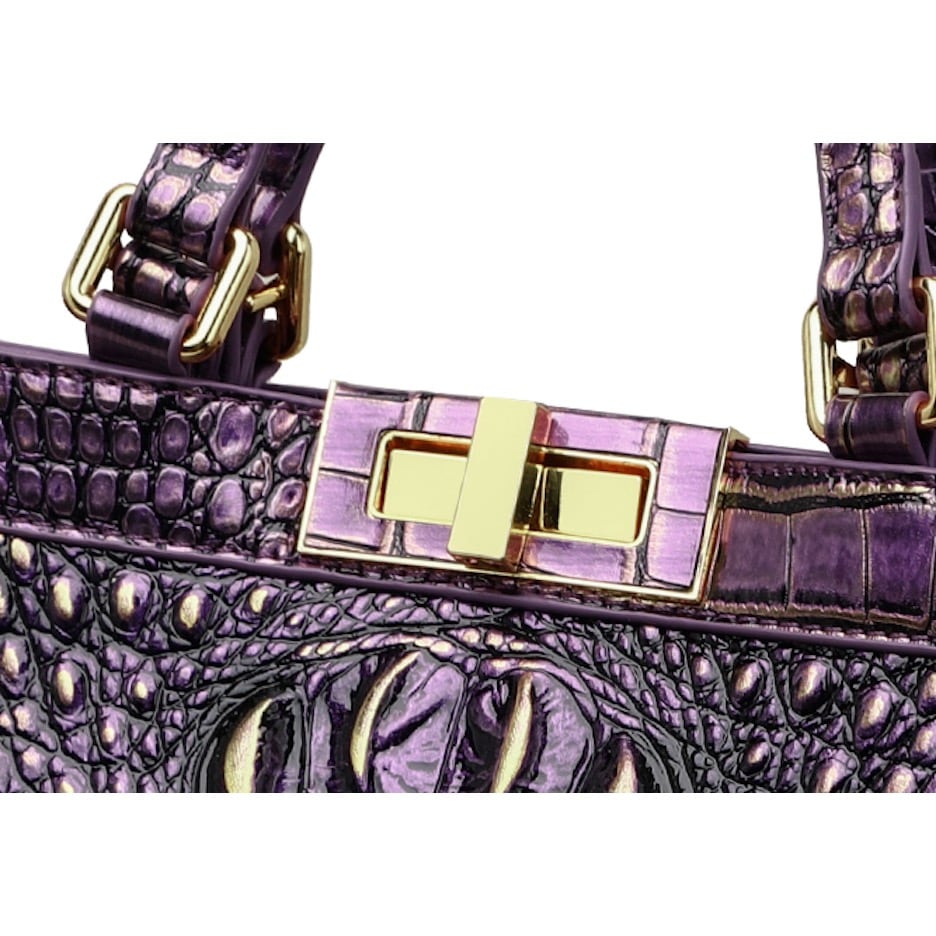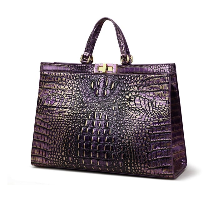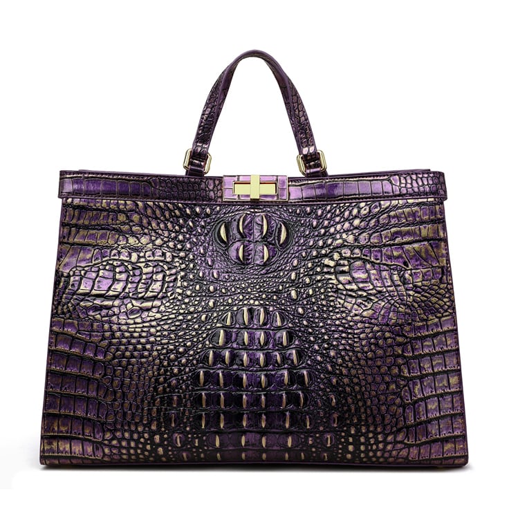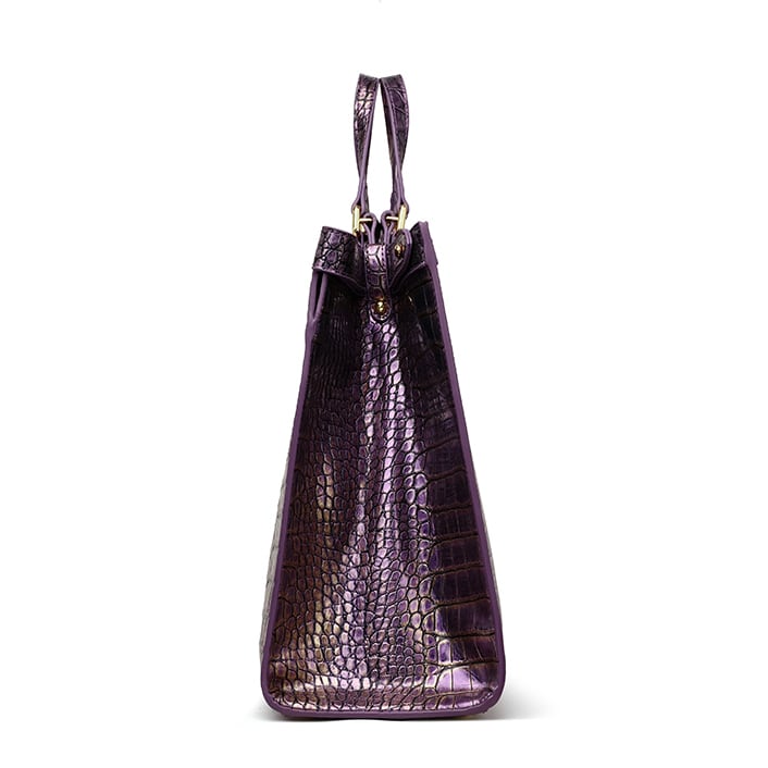 メタリック調のエンボス加工がほどこされたハンドバッグ。