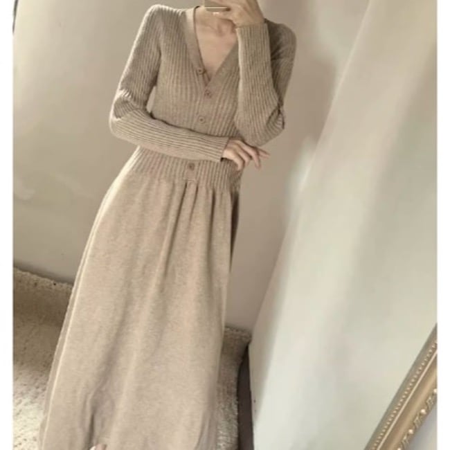 ふんわりとしたシルエットが特徴のニットワンピース。 Vネックのカーディガンとスカートがドッキングしたかの様なデザイン。 一枚でお出かけスタイルが完成する優秀なワンピースです。 【商品詳細】 カラー:ホワイト、ベージュ、ブラック 【商品サイズ】 S:肩幅 34-36cm/胸囲 90cm/着丈 100cm M:肩幅 36-38cm/胸囲 92cm/着丈 102cm L:肩幅 38-40cm/胸囲 94cm/着丈 104cm XL:肩幅 40-42cm/胸囲 96cm/着丈 106cm ※海外製品につき1cm~3cmの誤差がある場合が ございます。予めご了承くださいませ。 表記は目安として参考にしてください。 【お届けについて】 こちらの商品は海外店舗より直接発送となる為、 ご入金から1~3週間前後で発送致します。 (商品の状況によっては3週間以上かかる場合も あります。その際はご連絡させていただきます) ※沖縄・離島は、送料1000円を頂戴しております。 ◼️注意事項 ・タイミングによっては 商品在庫切れにより 注文キャンセルとさせていただく場合も ございますので、予めご了承くださいませ。 ・こちらは海外インポート商品となります。 日本製とは検品基準とは異なり、作りが あまい場合がございます。 ・お手持ちのPCやスマートフォンの画面により 商品の色に若干異なる場合がございます。 ・イメージ違いやサイズ等、お客様都合による交換、 返品、キャンセルは対応出来かねます。 ———————————————— ご購入前に必ずお読みくださいませ ↓ ↓ ↓ https://shop.gramu-official.jp/about —————————————————