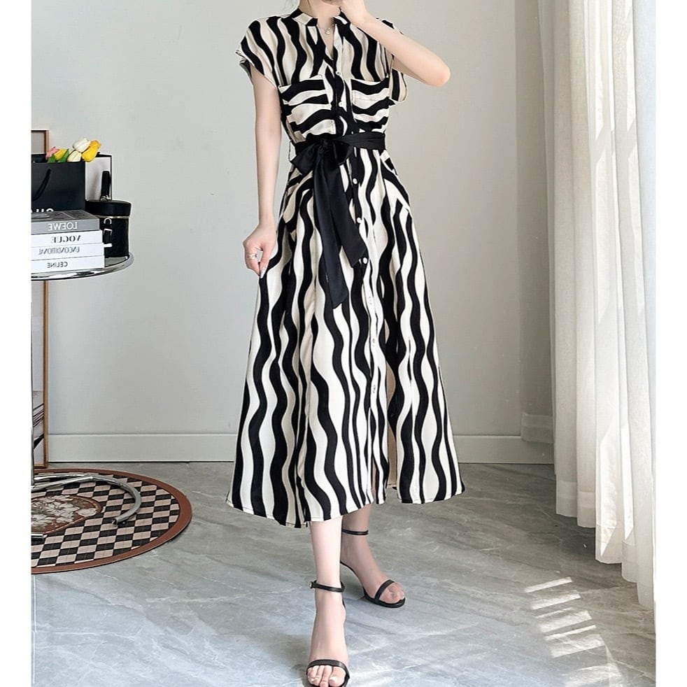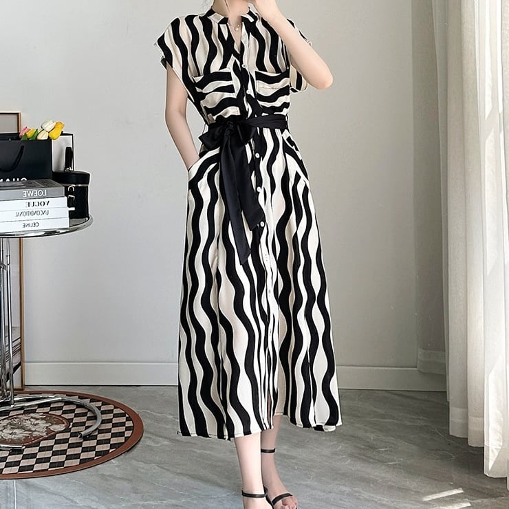 ウエストのリボンが可愛いシャツワンピース。 ウェーブのストライプ模様が目を惹くモダンなデザイン。 これからの季節、デートやお出かけにぴったりな一着です。 【商品詳細】 カラー:ホワイト×ブラック 素材:ポリエステル 100% 【商品サイズ】 S:肩幅 37cm/胸囲 92cm/着丈 122cm/袖丈 34cm/袖巾 34cm/ウエスト(ゴム入り) 64cm M:肩幅 38cm/胸囲 96cm/着丈 123cm/袖丈 35cm/袖巾 36cm/ウエスト(ゴム入り) 68cm L:肩幅 39cm/胸囲 100cm/着丈 124cm/袖丈 35cm/袖巾 37cm/ウエスト (ゴム入り)72cm XL:肩幅 40cm/胸囲 104cm/着丈 125cm/袖丈 36cm/袖巾 39cm/ウエスト(ゴム入り) 76cm 2XL:肩幅 41cm/胸囲 108cm/着丈 126cm/袖丈 36cm/袖巾 40cm/ウエスト(ゴム入り) 80cm ※海外製品につき1cm~3cmの誤差がある場合が ございます。予めご了承くださいませ。 表記は目安として参考にしてください。 【お届けについて】 こちらの商品は海外店舗より直接発送となる為、 ご入金から1~3週間前後で発送致します。 (商品の状況によっては3週間以上かかる場合も あります。その際はご連絡させていただきます) ※沖縄・離島は、別途送料を頂戴しております。 ◼️注意事項 ・タイミングによっては 商品在庫切れにより 注文キャンセルとさせていただく場合も ございますので、予めご了承くださいませ。 ・こちらは海外インポート商品となります。 日本製とは検品基準とは異なり、作りが あまい場合がございます。 ・お手持ちのPCやスマートフォンの画面により 商品の色に若干異なる場合がございます。 ・イメージ違いやサイズ等、お客様都合による交換、 返品、キャンセルは対応出来かねます。 ———————————————— ご購入前に必ずお読みくださいませ ↓ ↓ ↓ https://shop.gramu-official.jp/about —————————————————